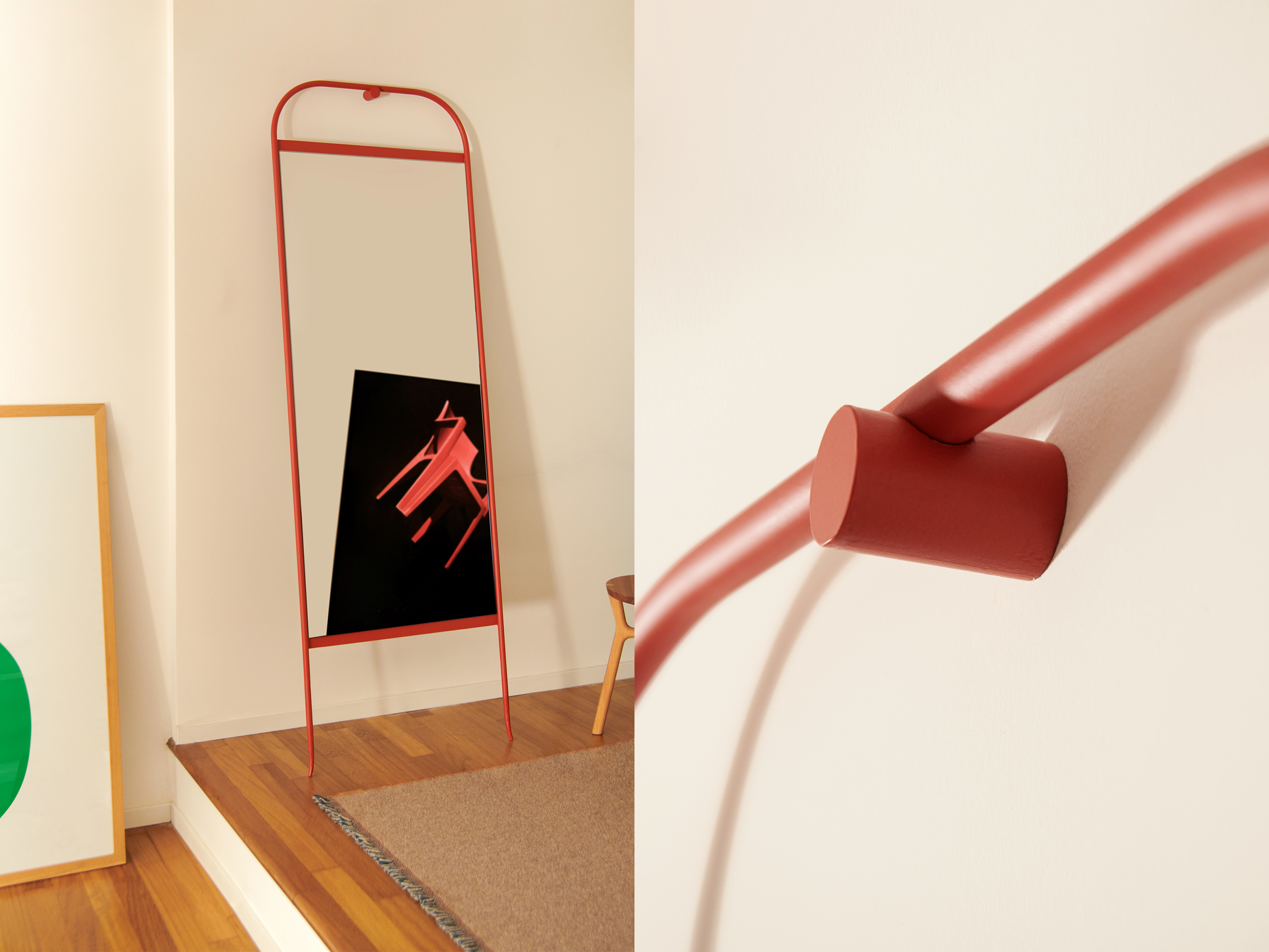 The free-standing mirror has two special curved, tapered, hand-forged legs.