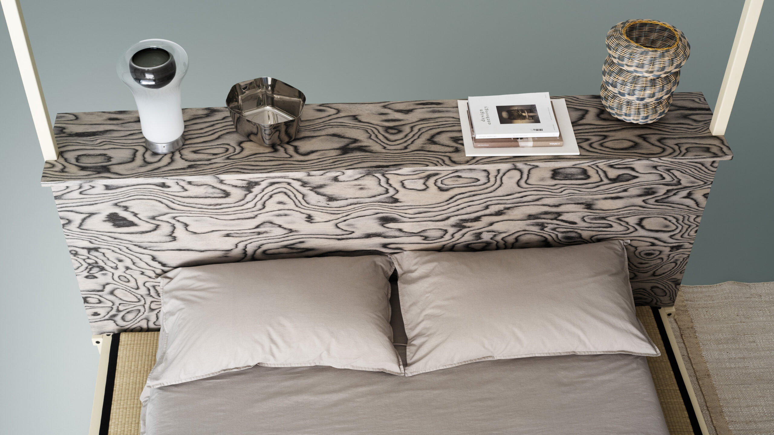 Tatamino is available in two versions: 100×200 cm (single tatami, single mattress) and 200×200 cm (double tatami, double mattress). In the smaller model, the system reveals a dual purpose: on one side as a bed or sofa with a wooden partition, and on the other as a desk, shelf, side table, or space to be personalized.